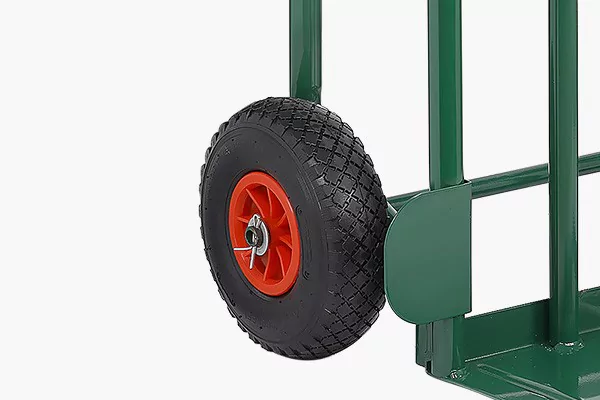 Mit Luftreifen bietet unsere Sackkarre Stabilität und Stoßabsorption, wodurch sie für alle Untergründe geeignet ist und mühelos Ladungen transportieren kann.